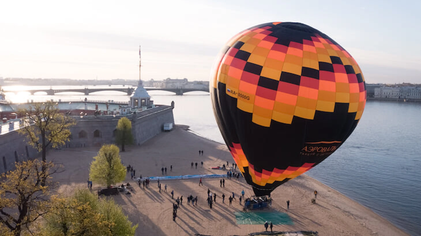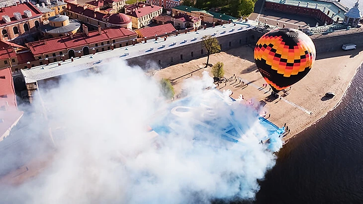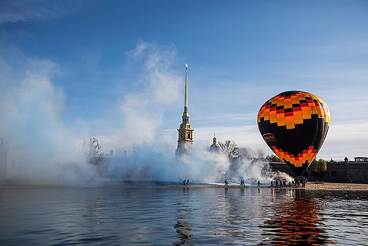 Коронавирус не помешал празднику. Уже в 6 утра с набережной у Петропавловской крепости поднялся воздушный шар с привязанным к нему гигантским баннером.