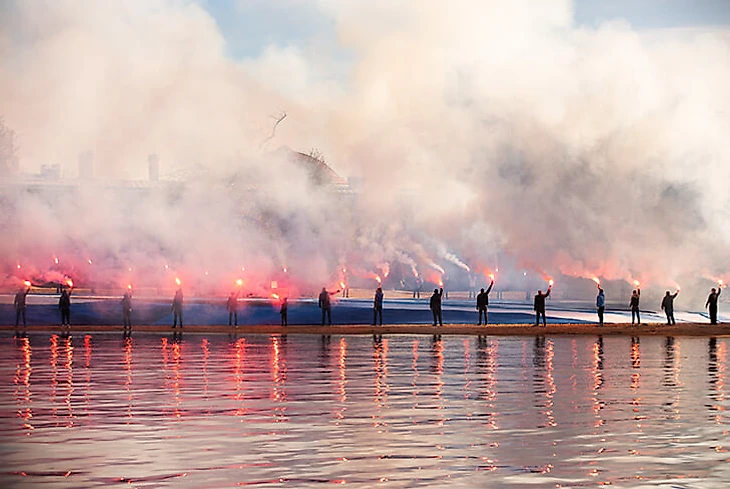 На земле акцию поддержали фанаты с пиротехникой.