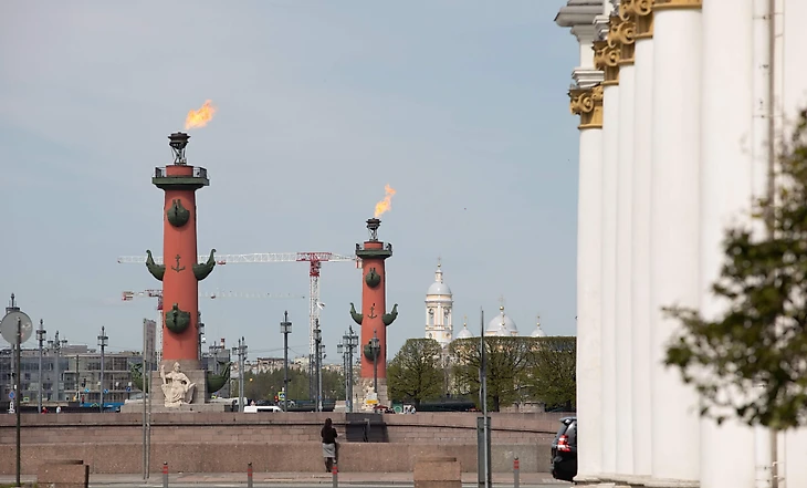 Одновременно в 12:00 зажглись Ростральные колонны на стрелке Васильевского острова – тоже в честь важной для города даты.
