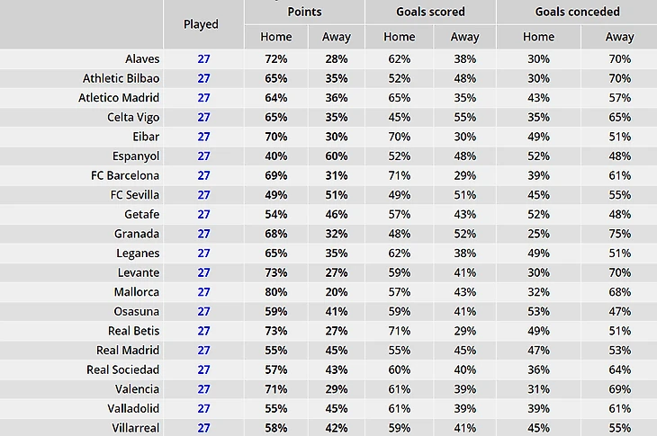 Лишь «Осасуна» (53%), «Хетафе» (52%) и «Эспаньол» (52%) пропустили дома больше, чем в гостях.