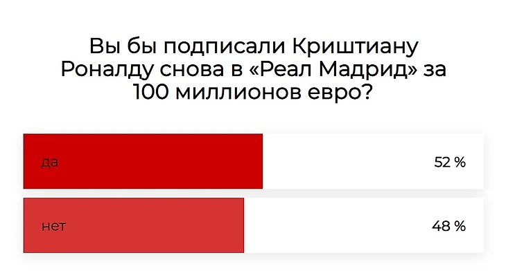 Испанское издание Marca провела опрос среди своих читателей, где с минимальным перевесом победил вариант с возвращением Роналду в «Реал» за €100 млн., даже при учёте того, что португальцу уже 35 лет.