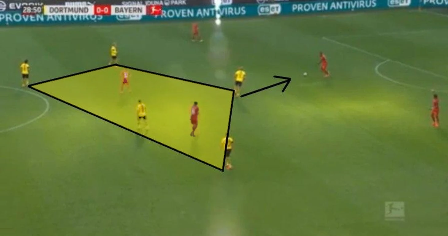 Когда какой то защитник Баварии, в похожей ситуации начинал тащить мяч на пытаться находить варианты для развития атаки чуть выше, то на него начинал выбрасываться игрок из блока, а его позицию закрывал ближайший к нему и флангу игрок. Тогда для в блоке, конечно же, оставалась дыра, но что бы туда отдать передачу нужно либо делать заброс, либо обходить с фланга. Второй вариант закрыт, по скольку на тебя уже выбросился игрок и создал дуэль 1 в 1. Так что тут либо пасуй ближнему, либо безнадежно иди в дриблинг.