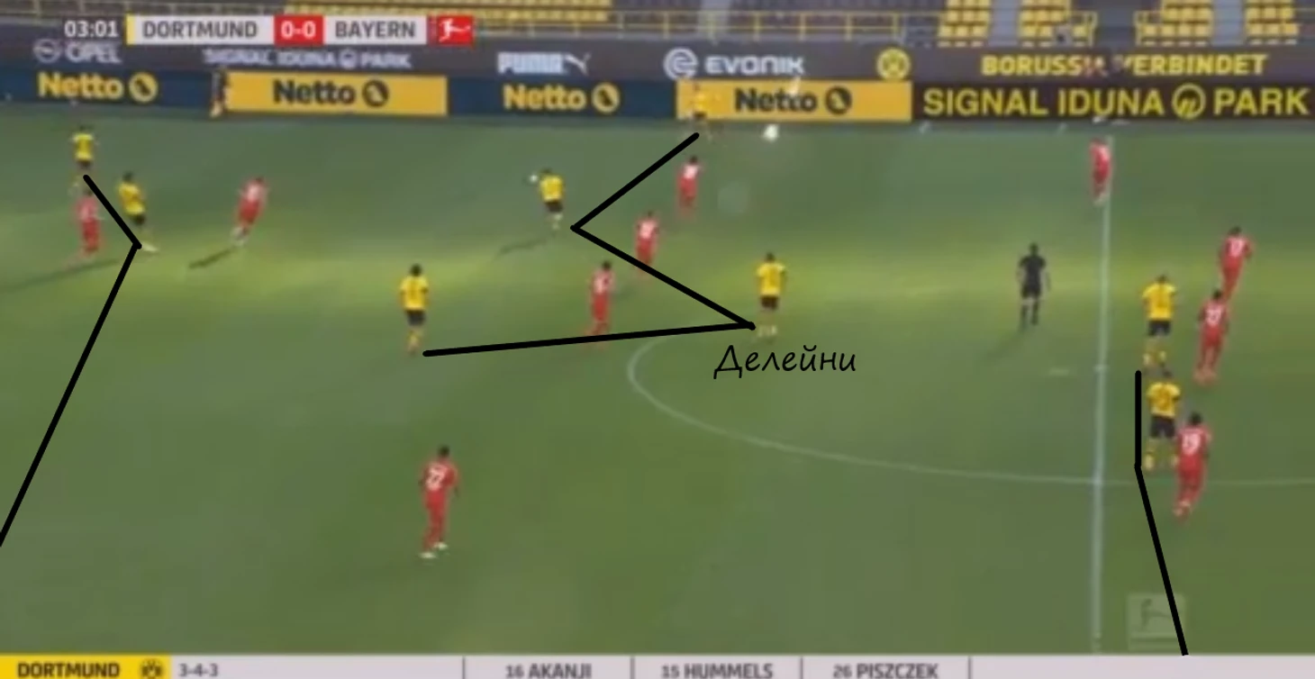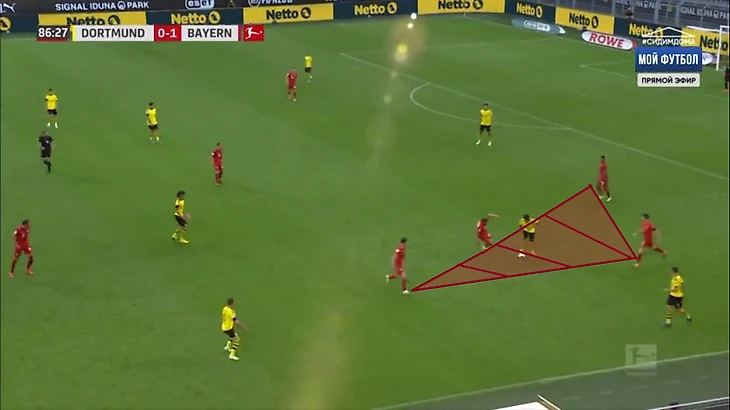 Здесь таковым аспектом послужил блок Баварии. Он стал более плотным, никак не поддавался на уловки компактности, фланговые защитники Баварии отлично персонально закрывали фланговых защитников Боруссии, внутренние коридоры закрывали опорники, а центральный коридор, который образовался в сути перекрывали атакующие полузащитники.