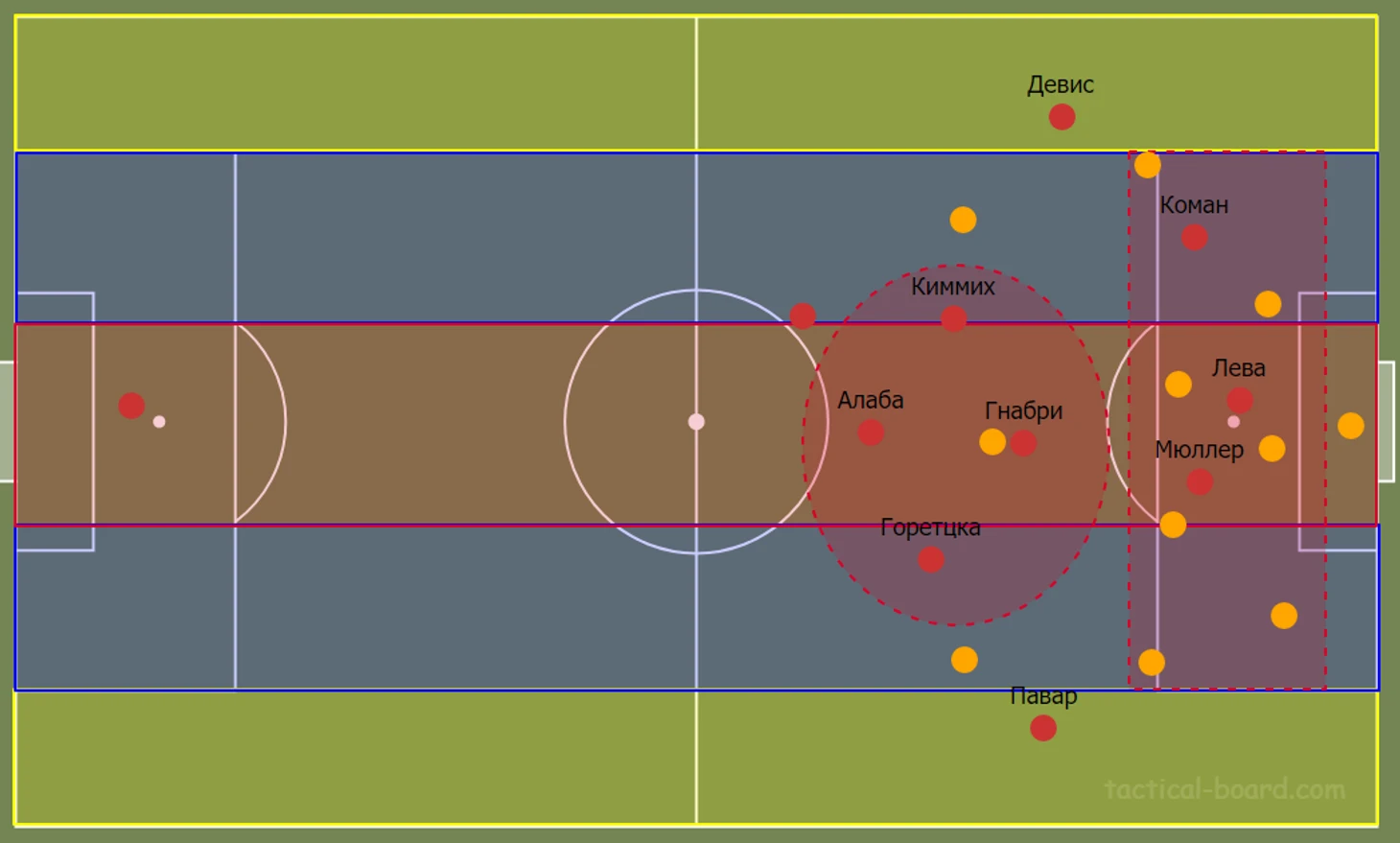 Позиционная игра, а точнее ее часть, у Баварии заключалась в создании насыщенности в чужой штрафной площади, и тем самым освобождение 14 зоны, которая является самой опасной зоной во всем футбольном поле при внедрении туда мяча.