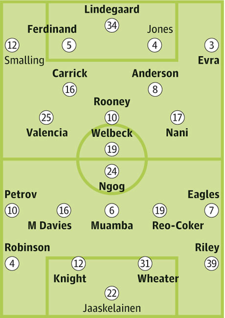 Запасные: Де Хеа, Амос Гиггз, Пак, Диуф, Эванс, Кин, Рафаэль, Бербатов, Фраерз, Чичарито, Фабио, Скоулз