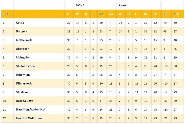 P.S.: По наиболее вероятному сценарию реструктуризации лиги "Хартс" останется в Премьершипе, а победитель Чемпионшипа "Данди Юнайтед" и занявший второе место "Инвернесс КТ" станут 13 и 14 участниками высшей лиги. Если реструктуризация проведена не будет, "Хартс" будет отправлен в Чемпионшип, а промоушен в Премьершип получит только "Данди Юнайтед".