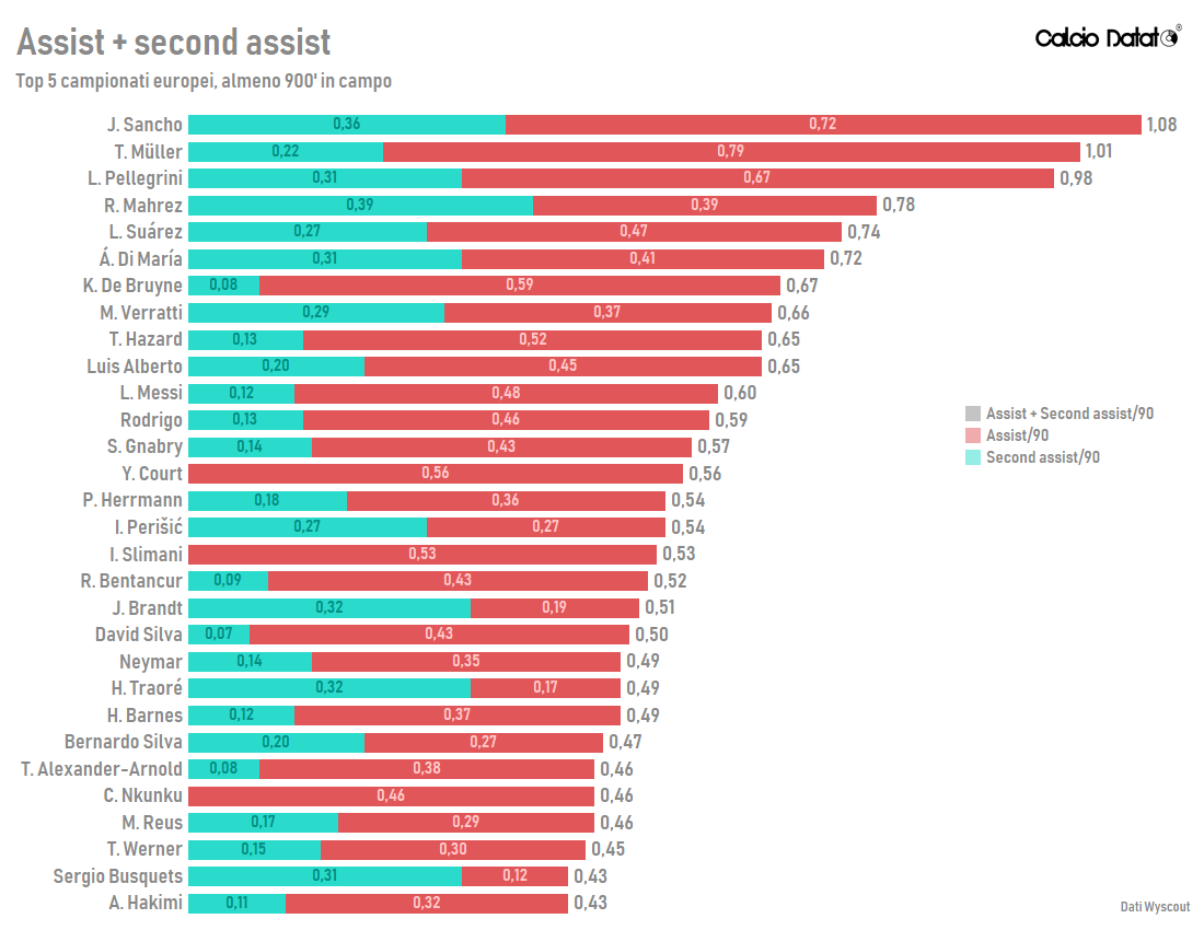 В категории до 25 лет у Пеллегрини нет конкурентов, а он сам давно вырвался за рамки возрастных сравнений. Он организует почти гол за игру (по голевым + предголевым) и намного превосходит Де Брюйне и Месси (на его уровне только Мюллер и Санчо). Причем держит уровень второй год. Травмы и неудобная позиция украли у Лоренцо половину прошлого сезона, но он все равно стал лучшим в ЛЧ по пасам под удар (4,4 за 90 минут) и вторым после Месси по разрезающим (0,7).