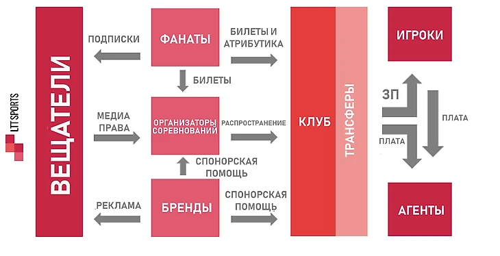 Современная футбольная экономика строится на ряде различных источников дохода (примерная структура от специалистов LTT Sports есть на диаграмме), но, так или иначе, можно выделить два основных: