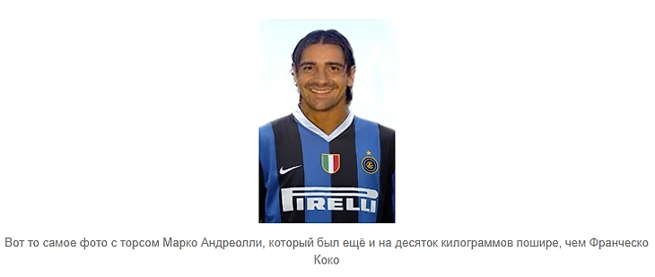 Через несколько сезонов ведения такой "базы данных" я стал замечать, что с одним из игроков клуба на фото что-то не так. Создавалось впечатление, будто его лицо выглядит как-то размыто, и словно не подходит к его телу. Потом я понял, что лицо просто было взято с прошлогодней фотосессии команды — на свежем групповом фото этот игрок отсутствовал. Я начал вычислять, чей же торс на фото, и, сопоставив с предсезонным групповым фото команды, обнаружил, что голова действительно «прифотошоплена» к телу совсем другого футболиста (если не ошибаюсь, чаще всего донором был Марко Андреолли). Это повторялось из года в год, пока в 2007-м Франческо Коко не закончил свой путь в «Интере», а через несколько месяцев и карьеру футболиста…