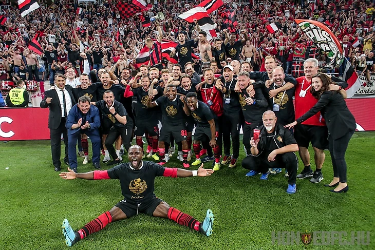 Сначала игроки «Гонведа» побежали праздновать с болельщиками без кубка, а просто в чемпионских майках – пока готовили площадку и все остальное.
