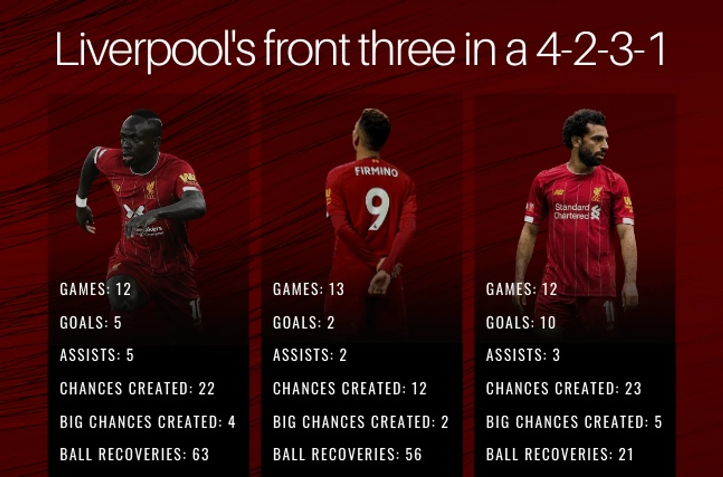 Судя по прошлогоднему использованию этой схемы Мане, Салах и Фирмино хорошо справлялись при смене роли. В этих матчах Ливерпуль забил 31 гол в 13 матчах, а их индивидуальная статистика впечатляла.То, как Фирмино будет играть при смене позиции вызывает наибольшие вопросы. Мане и Салах будут, по сути, выполнять те же обязанности, что и в 4-3-3, разве что работы в обороне прибавиться.