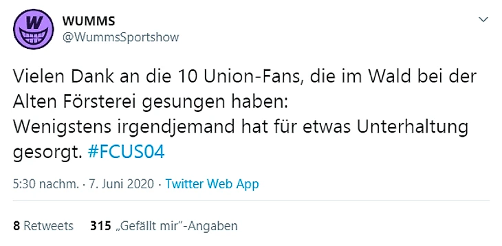 «Большое спасибо тем 10 болельщикам «Униона», которые поют в лесу у стадиона. Хоть кто-то заботится о развлечении.»