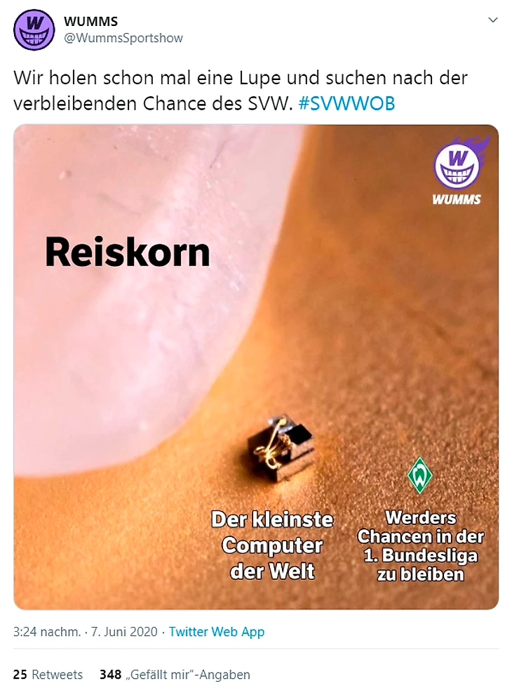 «Нам уже приходится брать лупу, чтобы искать оставшиеся шансы «Вердера». Для сравнения: рисовое зерно, самый маленький компьютер на Земле и шансы «Вердера» остаться в первой Бундеслиге.»