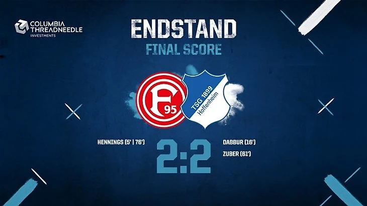 Во втором тайме «Фортуна» продолжала идти вперед, но к навесам гости приноровились, а больше хозяевам особо предложить было нечего. В то же время контратаки «Хоффенхайма» даже в меньшинстве становились все опаснее, и вскоре Цубер четким низовым ударом замкнул передачу Скова. Были у гостей и другие моменты, но скоро неравные составы сказались и «Хоффенхайму» пришлось отойти к своим воротам. Впрочем, придумать что-то интересное «Дюссельдорфу» не удавалось и помог случай в виде пенальти. Нордтвейт проиграл позицию Томми и слегка придержал его сзади, этого оказалось достаточно для одиннадцатиметрового. Хеннингс был точен, а матч так и завершился ничьей 2:2