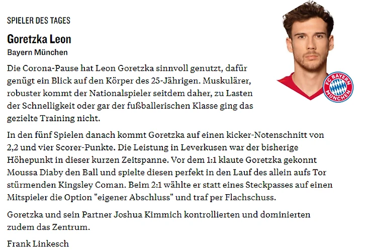 На сей раз таким героем стал Леон Горецка. В середине тайма, отобрав мяч в центре поля, он отправил Кингсли Комана на рандеву с Градецки – 1:1. А затем сам вывел «Баварию» вперед, эффектно пробив с левой из-за штрафной. Третью же «пробоину» «Байер» успел получить еще до перерыва. Это Йозуа Киммих сменил шедевральные голы на изящные ассисты. «Мистер универсал» выдал длинный заброс за спину защитникам; не выручил Тапсоба, не спас Градецки – 3:1.