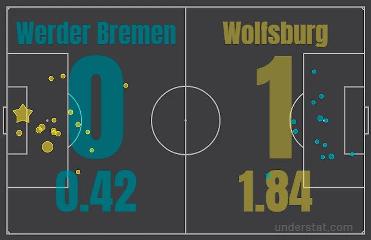 Воскресным днем в Бремене местный «Вердер», борющийся за выживание в Бундеслиге, принял на своем стадионе «Вольфсбург», который всеми силами старается попасть в зону еврокубков. От этой игры мало кто ожидал высокой результативности, ведь ничья устраивала обеих команд. Возможно, именно поэтому начало первого тайма не было богато на события. Первый по-настоящему опасный момент случился на 24-й минуте матча, когда Сарджент, получив мяч в штрафной, попытался пробить по воротам, однако защитники «Вольфсбурга» сработали оперативно, вовремя накрыв удар американского нападающего. «Волки» практически сразу ответили Бремену опасной атакой на 28-й минуте встречи; Мехмеди получил мяч в штрафной соперника, попытался пробить по воротам, но попал в защитника «Вердера», после чего «Вольфсбург» получил право исполнить угловой, розыгрыш которого «волки» не смогли довести до гола. Непростой для вратаря удар на 31-й минуте нанес Осако, но Кастельсу удалось отбить мяч. В концовке первого тайма футболисты доставили сложности главному арбитру встречи – Бибиане Штайнхаус. На 39-й минуте Эггештайн попытался пробить по воротам, но мяч попал в руку Шлагеру – встал вопрос о назначении пенальти. Воспользовавшись помощью VAR, Штайнхаус приняла решение продолжить игру без назначения одиннадцатиметрового.