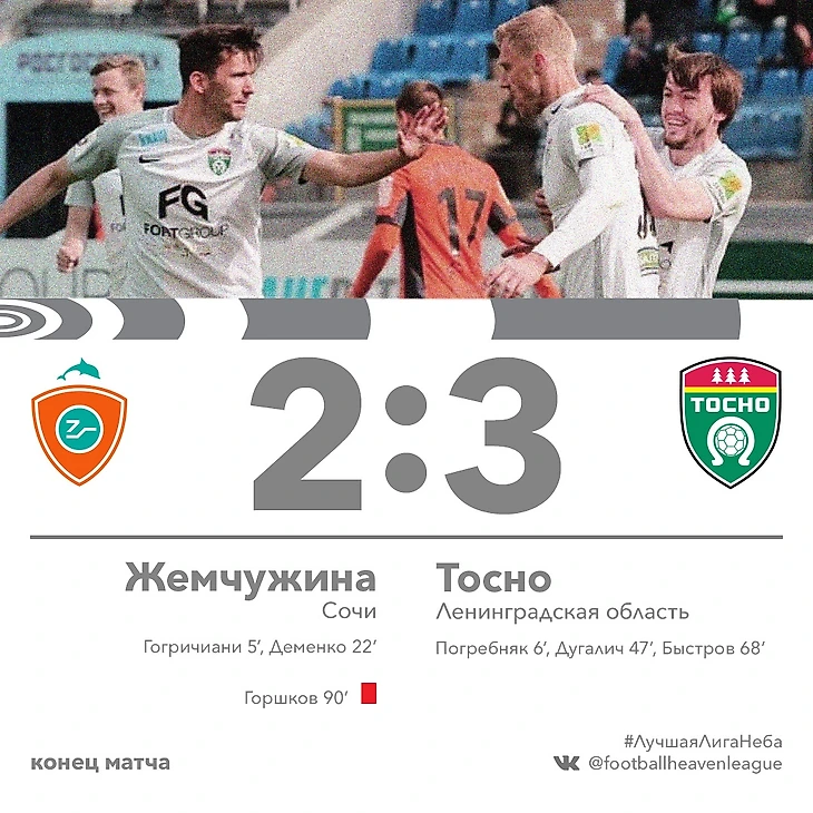 Настал второй тайм. В раздевалке Жемчужины, похоже, окончательно разделили шкуру неубитого северного медведя и посчитали задачу на игру выполненной, в то время, как в соседней раздевалке гостей царил мозговой штурм, как быть. Стало ясно - так дальше продолжаться не может! Сразу же, как только второй тайм начался, гости заработали угловой. Подача, Погребняк бьет головой - штанга, но тут как тут был Раде Дугалич. Мы уже привыкли к тому, что на этой стадии забивают прежде не особо заметные защитники, но этот пушечный гол перевернул ход игры и надломил сочинцев! Постепенно атаки оранжевых, продолжавшиеся про инерции и дальше, превратились в смешное подобие навала, которое защита ленобластных отражала легко и непринужденно. Ну а на 69 минуте случился момент, вызвавший некоторые споры в Сочи - Гогричиани был сбит в штрафной тосненцев, те перехватили мяч, прошли от ворот до ворот и Быстров вышел один на один с Тумиловичем, не оставив белорусскому голкиперу никаких шансов! Черно-белые перехватили инициативу окончательно и до самого финального свистка с ней не расставались, тем более, что хозяева сняли с игры и Гогричиани, и Аль-Халифу, что в свете данных обстоятельств означало досрочную капитуляцию. Когда финальный свисток прозвучал, в Тосно, да и во всей Ленобласти было ликование - никто не верил, что один из беспросветнейших аутсайдеров групповой стадии выйдет в медальный зачет!