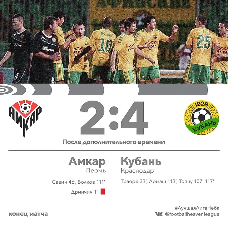 На второй тайм тренерский штаб красно-черных бросил в бой Великого Спасителя Красаву. Савин намек понял без проблем и ТУТ ЖЕ, В ПЕРВОЙ ЖЕ атаке сравнял! Кушев вышел один на один, с линии штрафной пробил, поторопившись, в Беленова, но остался с мячом, ушел на фланг и подал на дальнюю, ну а там Угол Головы не мог не забить! В дальнейшем был еще целый ряд опаснейших ситуаций, в концовке пермяки стали пожарить у своих ворот и отбиваться (сказалась усталость), однако в итоге впервые в истории Ф.Н.Л. мы увидели дополнительное время. Первый дополнительный тайм не принес ничего интересного с точки зрения голов, многие уже стали ставить на серию пенальти, НО! Бальде пробрался ближе к левому флангу, успел отдать на Аршавина прежде, чем его срубили, Андрей в касание навесил на Топчу, а тот с лета в касание же переправил мяч от штанги в ворота! Сумасшедший гол! Но не менее сумасшедшим оказался новый ответ Перми. Спустя 4 минуты Хузин подает в штрафную, в немного нелепом прыжке Волков бьет головой, и уже 2:2! Вот тут-то пенальти стали ждать все, но спустя всего минуту Ивелин Попов подает угловой. Казалось бы, амкаровцы отобьются, так как они были очень хороши на втором этаже в этой игре, но Игорь Армаш сказал свое веское НЕТ! Нарубин остался стоять перед воротами, защитники не ждали, как итог, Кубань снова впереди! Этот гол надломил Амкар, и в итоге спустя еще 4 минуты все тот же Аршавин переместился уже на правый фланг и опять же в касание выдал на Топчу, который, на сей раз головой, похоронил шансы Амкара на сохранение чемпионства, опять не выручил Нарубин...