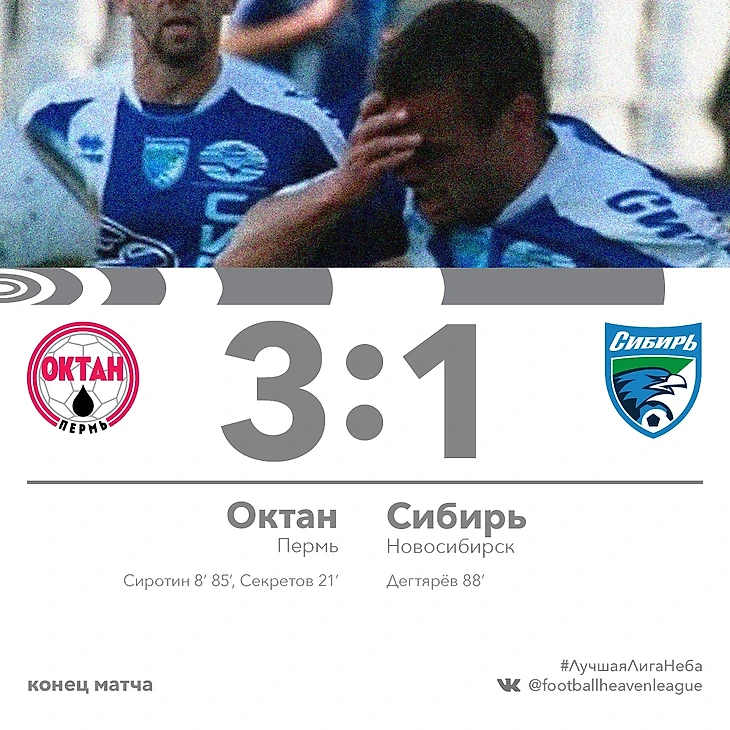 Во втором тайме ситуация на поле изменилась не слишком существенно. Сибирь больше атаковала, но очень грамотно действовала защита пермяков, кроме владения в центре поля, у сибиряков больше ничего не получалось. Тем не менее, зрители в самой концовке увидели еще два мяча. На 85 минуте Секретов оформил дубль, без проблем перевисев на втором этаже Молоша, а по сути в раздевалку гол престижа (да и то с добивания) у Новосибирска забил Дегтярев, заменивший Чижека, получившего микротравму в стыке с игроком Октана. Таким образом главная сенсация турнира Октан становится первым полуфиналистом турнира и уже никуда не вылетит!