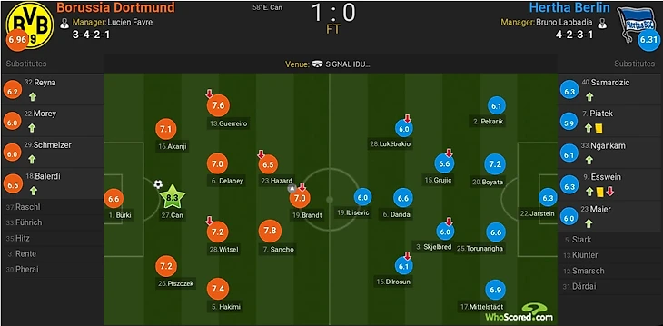В этой игре встретились две команды, которые любят забивать. Однако, в этот раз, мяч оказался в сетке всего один раз. Отсутствующего у Дортмунда Матса Хуммельса в центре обороны заменил Эмре Джан. СПОЙЛЕР: Он стал лучшим игроком на поле по итогам матча. У берлинцев лучшем тоже был защитник и тоже центральный - Дедрик Боята.