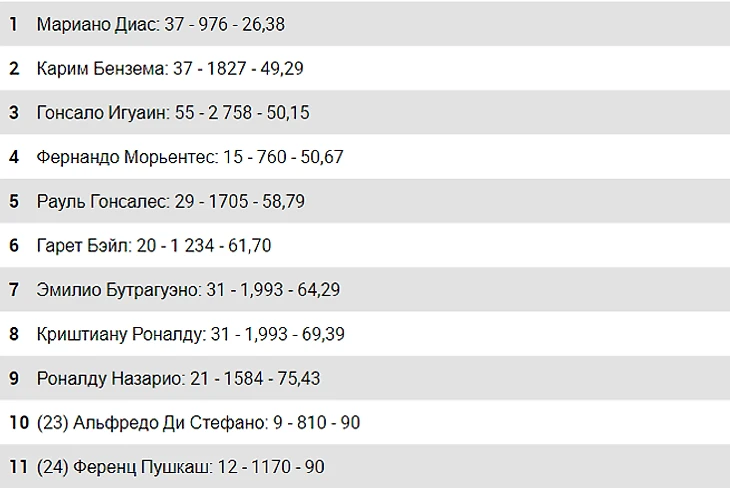 Карим Бензема также забил десять за 37 игр, но ему для этого понадобилось почти вдвое больше минут – в среднем 49,29 за матч. По этому показателю Диас обошел всех легенд клуба – от Ференца Пушкаша и Альфредо Ди Стефано до Рауля, Роналдо и Криштиану.