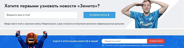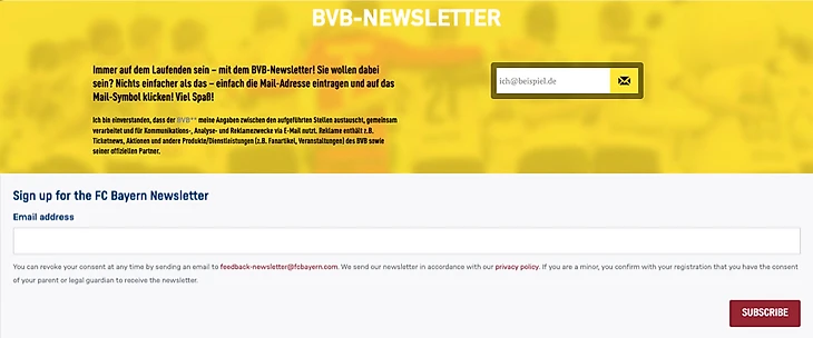 Если вы видите форму для подписки на рассылку прямо на главной странице клубного сайта, чаще всего, это означает, что клуб воспринимает свои письма как отдельный продукт и делает их круто. Вот так, например, выглядят формы для подписки на сайтах «Баварии» и «Боруссии».