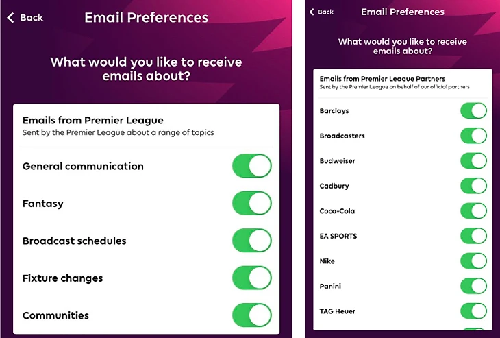 Если бренд уделяет e-mail-маркетингу меньше внимания, на рассылку вы, скорее всего, подпишитесь при регистрации на клубном сайте или в приложении. Причем, бренд может предложить вам подписаться не только на внутренние новости и акции, но и на спонсорские предложения. Вот сколько разных рассылок подарит вам при регистрации официальное приложение АПЛ – радуя ваш почтовый клиент свежей скидочкой, Nike и Panini не будут сомневаться в эффективности сотрудничества с лигой.
