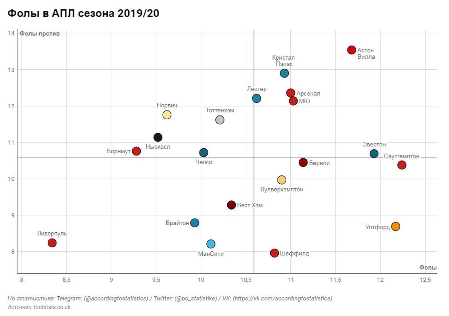 Наименее фолящей командой лиги с запасом стал «Ливерпуль» (8,34 фола в среднем за матч).