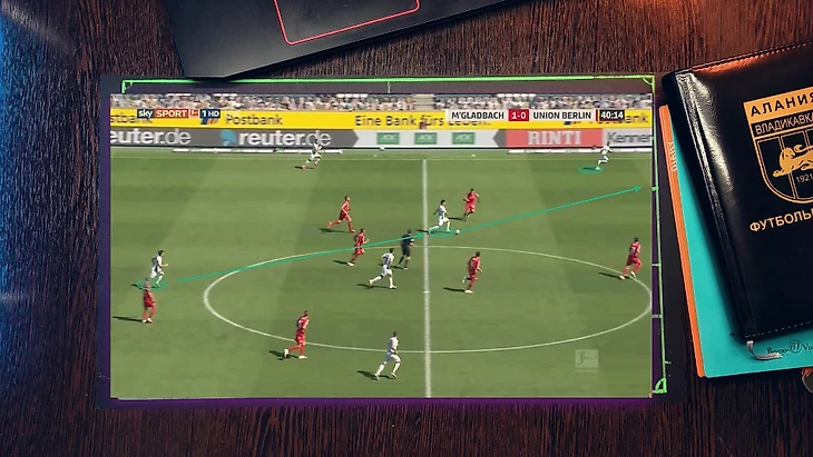 Также длинные передачи используются активно для преодоления плотного прессинга или средней линии, причем движение атакующих футболистов сильно сбивает с толку оборону. Два футболиста показывают всем своим движением, что передача пойдет в среднюю вертикаль, тем самым все начинают заполнять эту зону, однако, следует диагональ на фланг, где располагается уже один партнер по команде. В матче с тем же самым "Юнион Берлином" была именно такая передача, но пас был послан не совсем точно.