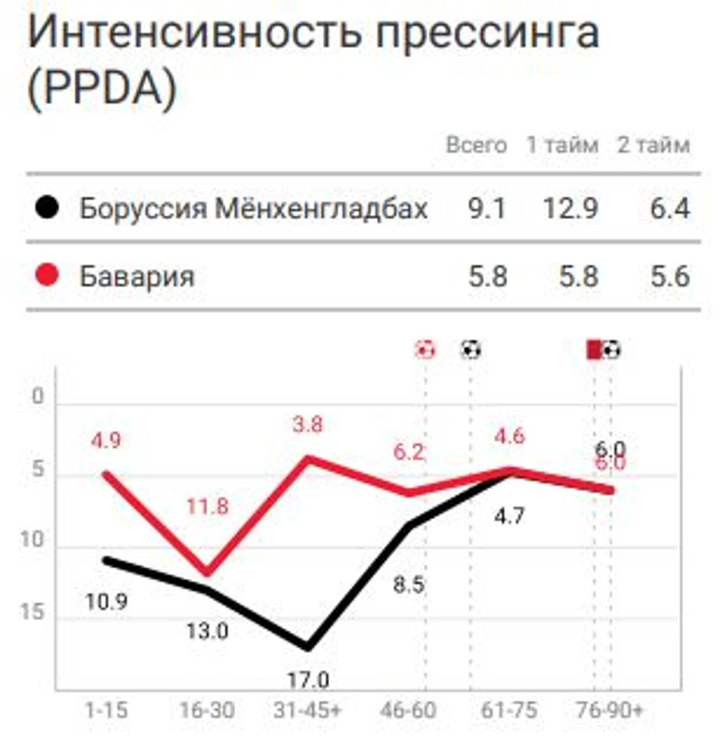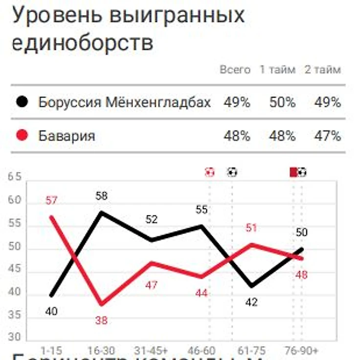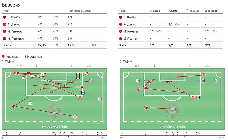Флик также использовал высокий прессинг, но куда более успешней, чем оппоненты, по сути, все длинные передачи на атакующих игроков были проиграны "гладбохом". Зато после того как хозяева поля стали встречать в среднем блоке по схеме 4-4-2 "Баварии" стало намного тяжелее создавать опасные моменты и все чаще прибегала к дальним ударам или еще к одной крайности кроссам, которые так и не принесли должного результата.