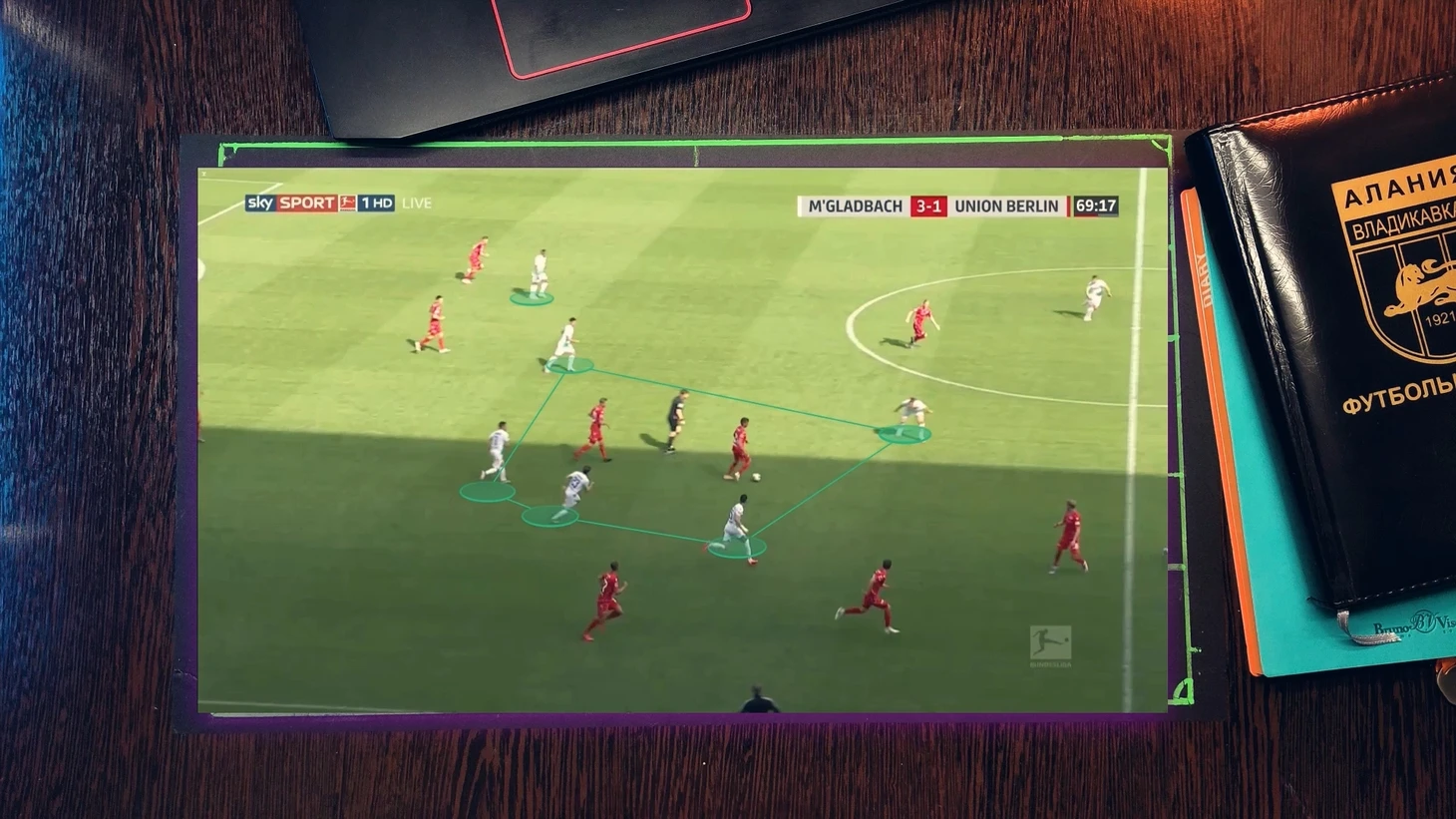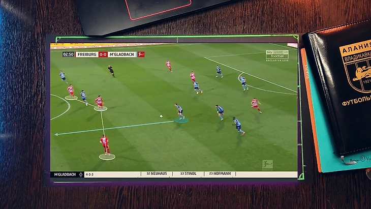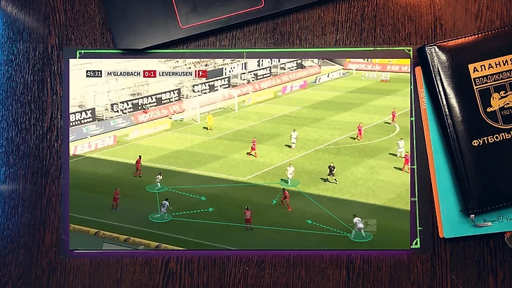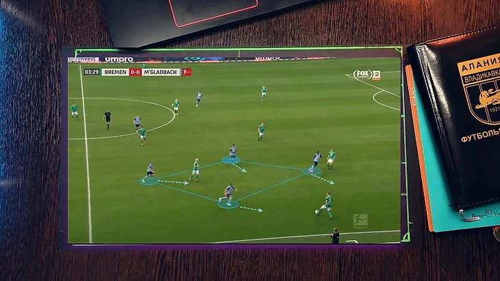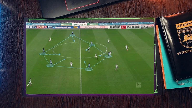 Типичная ситуация "гладбаха" - фулбэк остается в широкой позиции, что позволяет растягивать соперника или сменить фланг атаки за счет перевода мяча на него(фланговые защитники очень активные и охотно подключатся к атакам), ЦН остается в средней вертикали и связывает ЦЗ соперника, вингеры достаточно подвижны и оказывают отличную поддержку на флангах или смещаясь в полуфланги перегружают зону, а затем переключаются и оказывают поддержку ЦН.