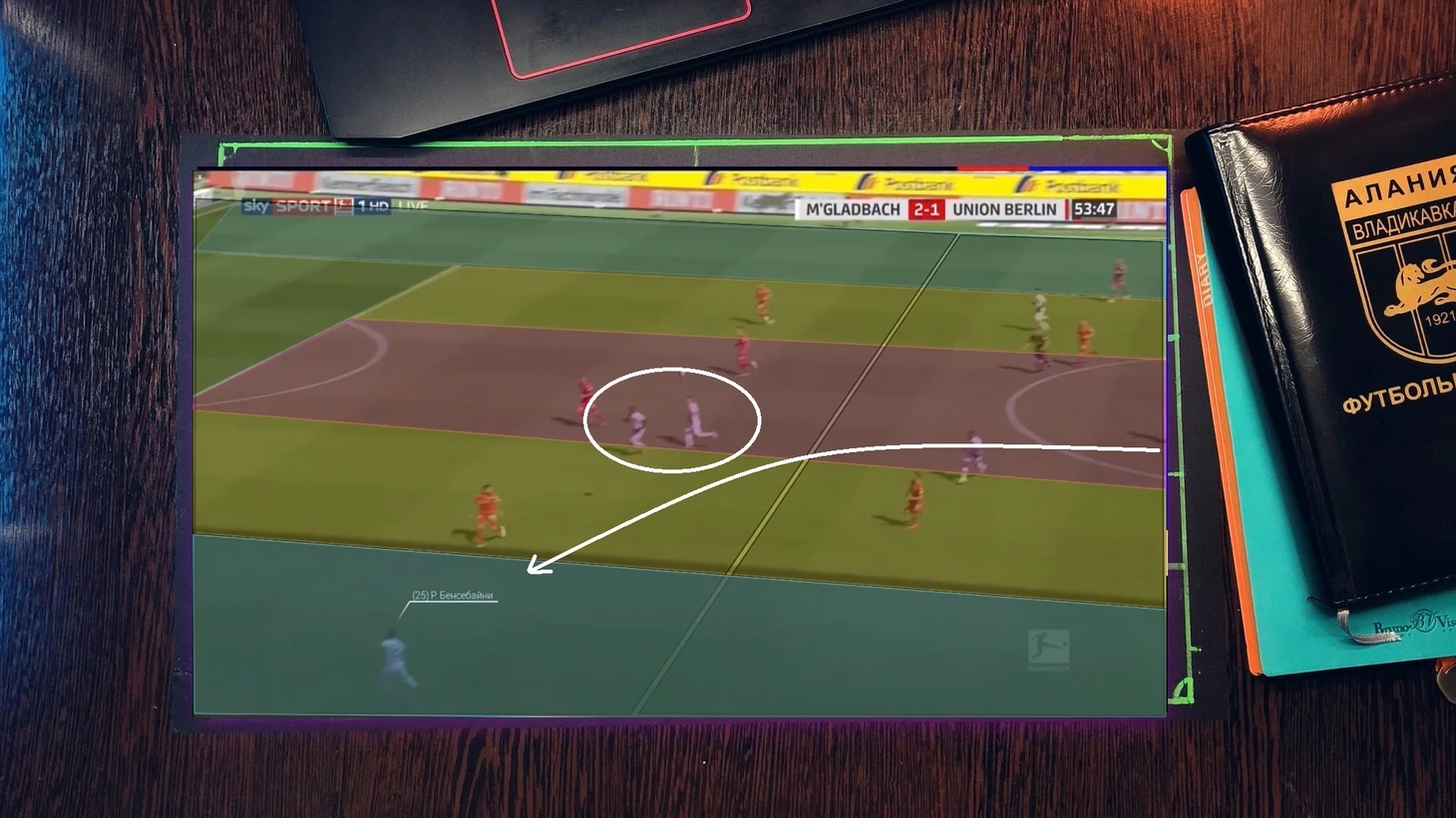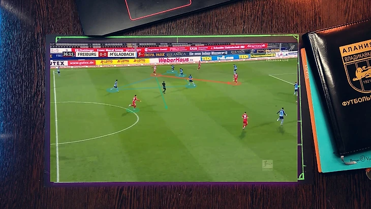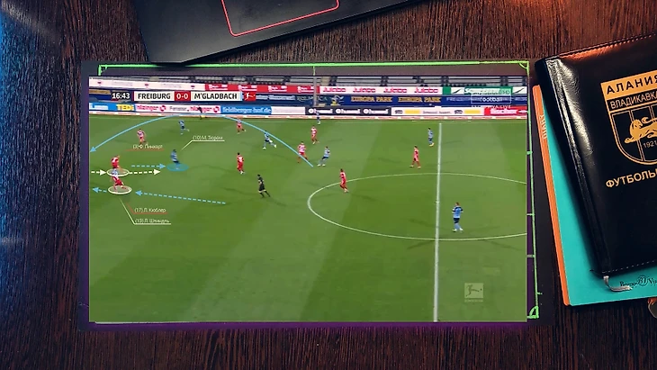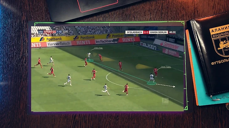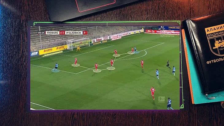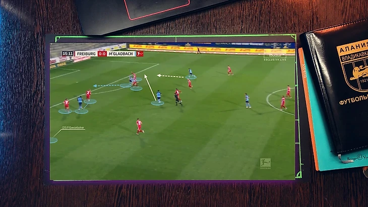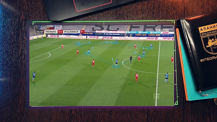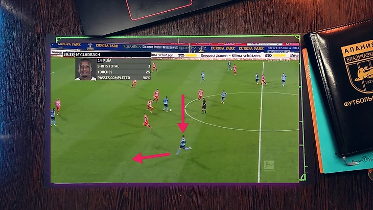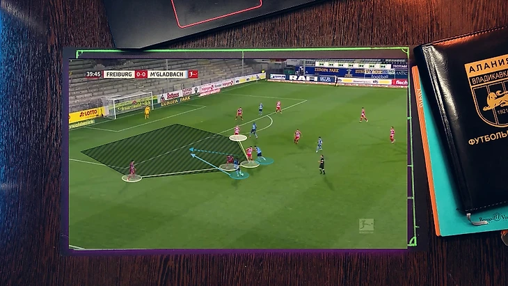 Как при атаке "Фрайбурга", 4 футболиста "гладбаха" давят со всех сторон на бегущего футболиста, при этом они имеет как минимум две продвигающие атаку передачи, но из-за нехватки времени он принимает не самый лучший выбор, в средней вертикали был куда более лучший вариант, тем более фланг был перегружен.