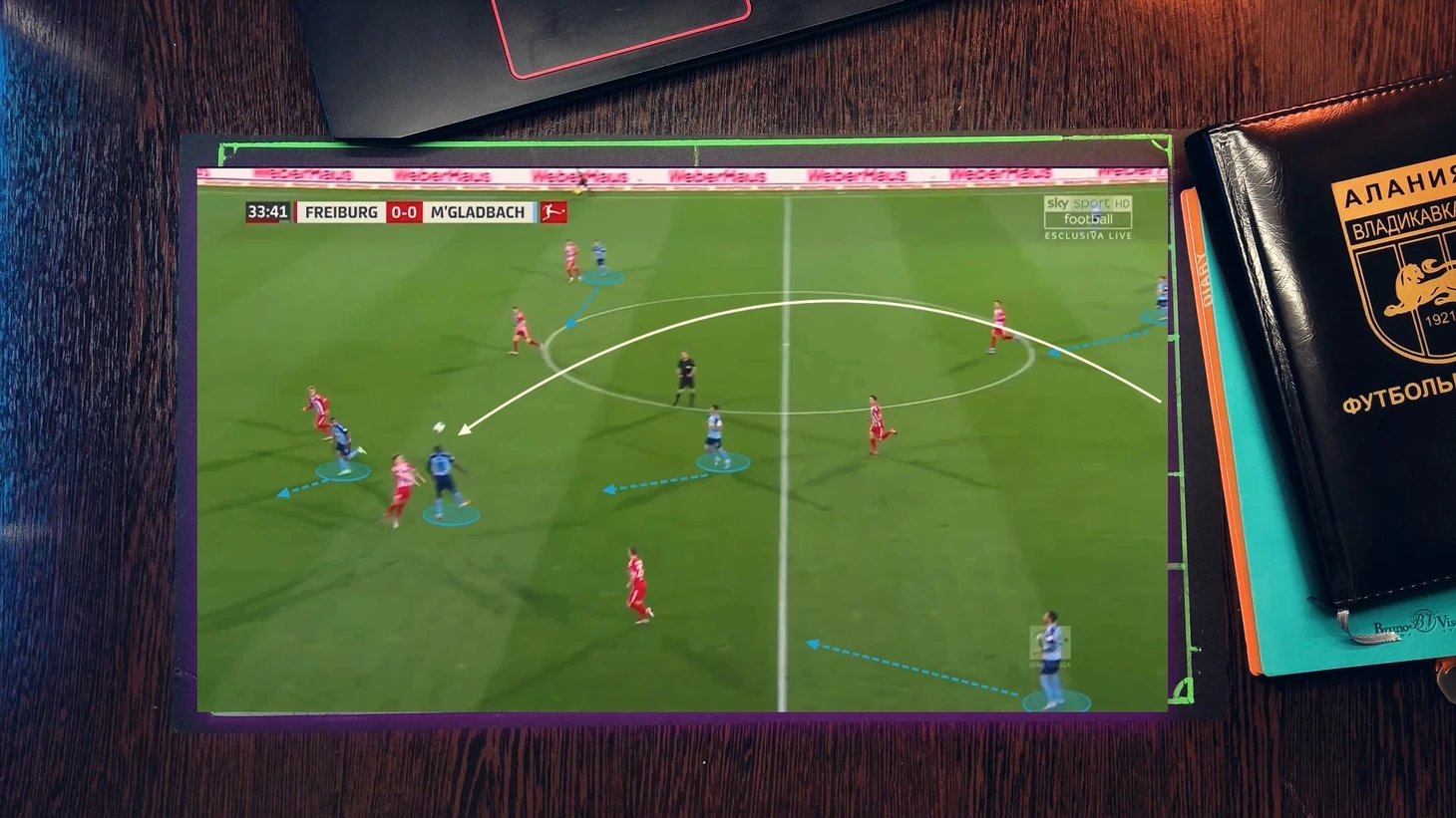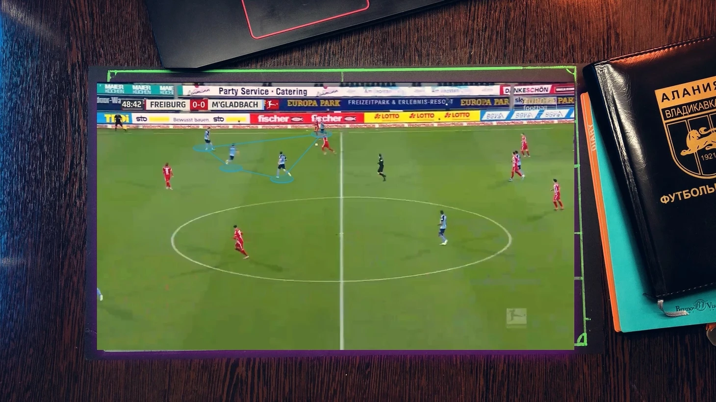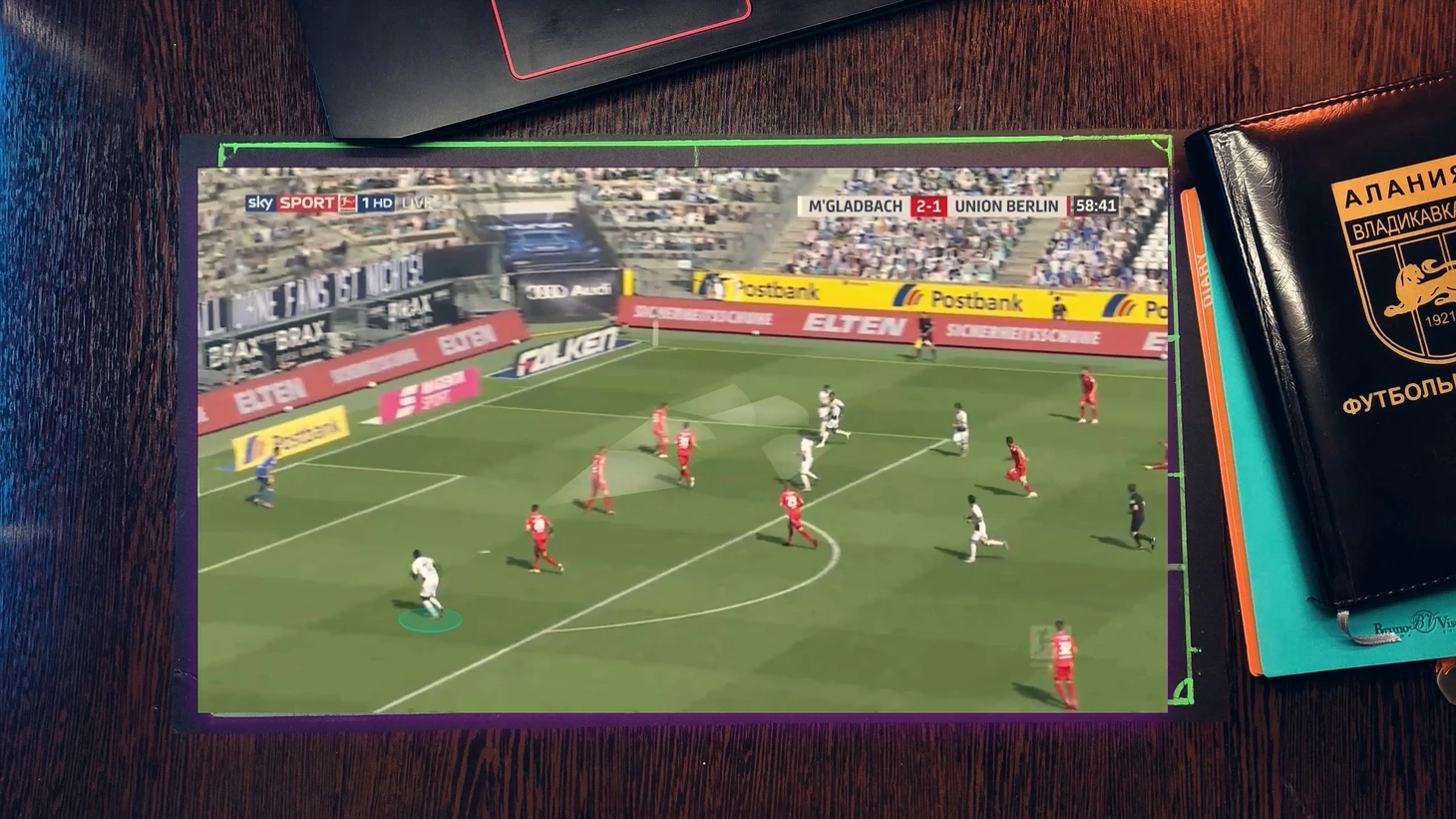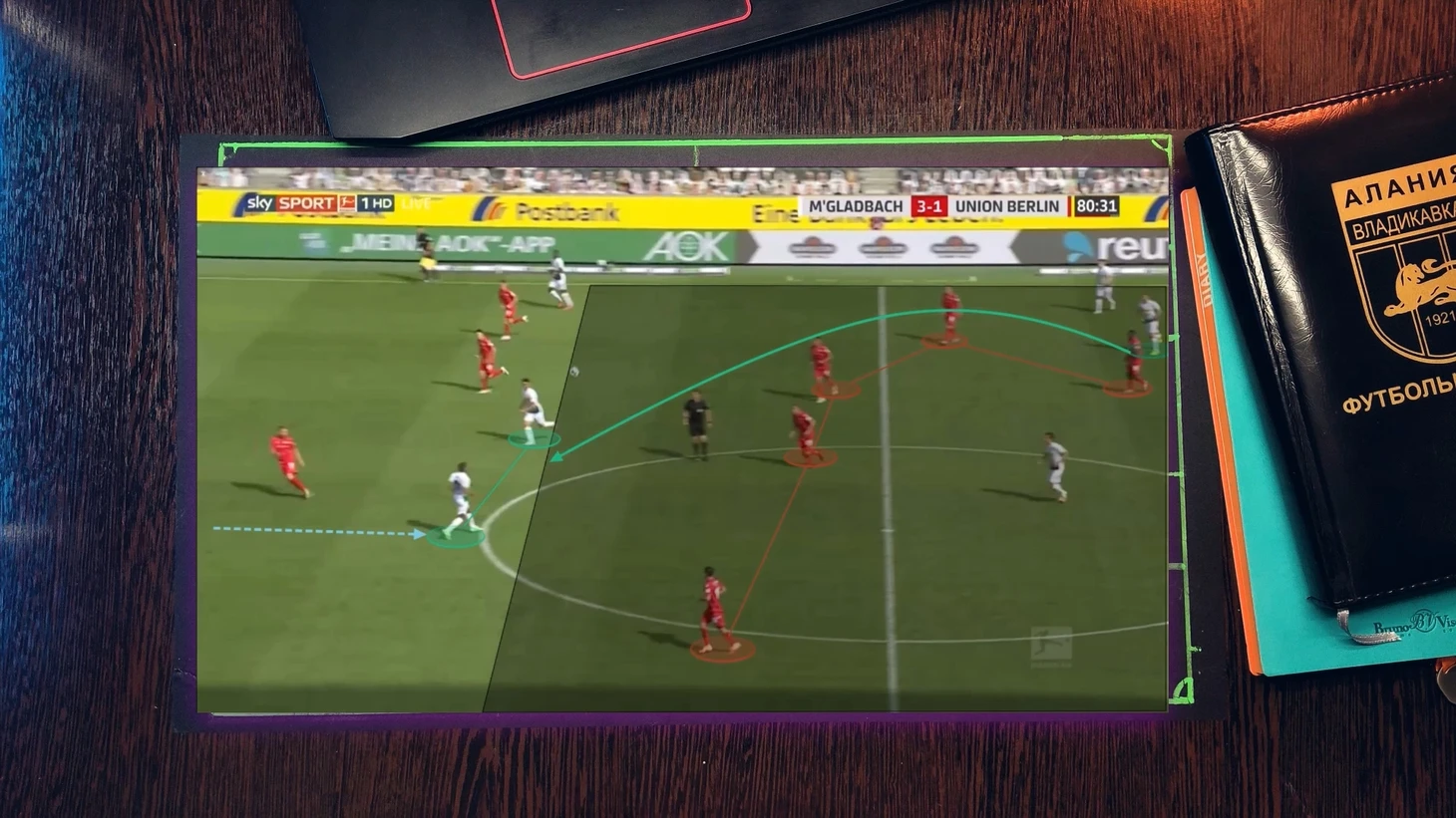 Как при атаке "Фрайбурга", 4 футболиста "гладбаха" давят со всех сторон на бегущего футболиста, при этом они имеет как минимум две продвигающие атаку передачи, но из-за нехватки времени он принимает не самый лучший выбор, в средней вертикали был куда более лучший вариант, тем более фланг был перегружен.