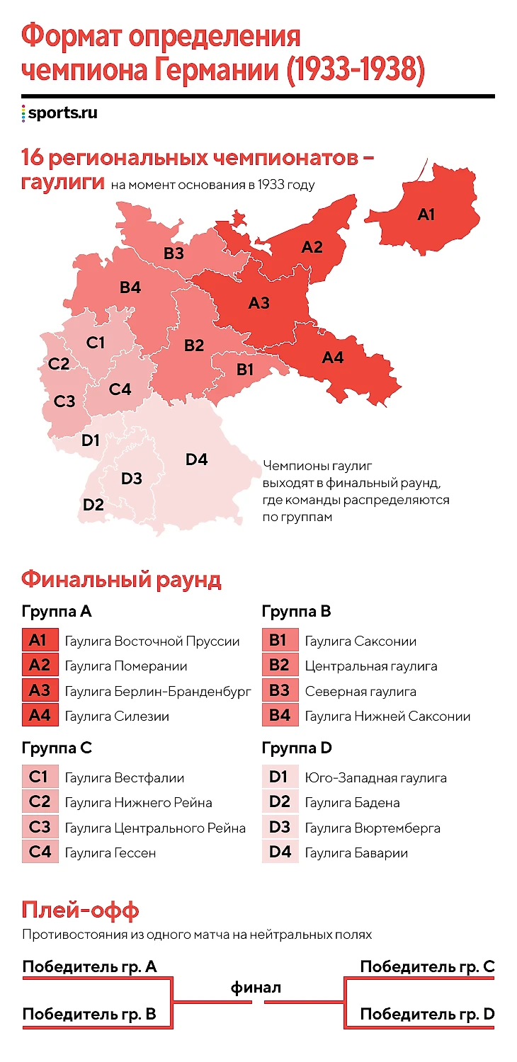 По мере присвоения нацистами приграничных территорий разрастался и чемпионат. Гаулиги появились в Эльзасе (Франция), Судетской области (Чехия) и округе Вартеланд (Польша). Плюс стали дробиться уже существующие – например, гаулига Баварии разделилась на северную и южную. В какой-то момент их стало больше 30, и от группового этапа пришлось отказаться. Победители гаулиг сразу попадали в плей-офф, причем пары формировались не путем жеребьевки, а по географическому принципу.