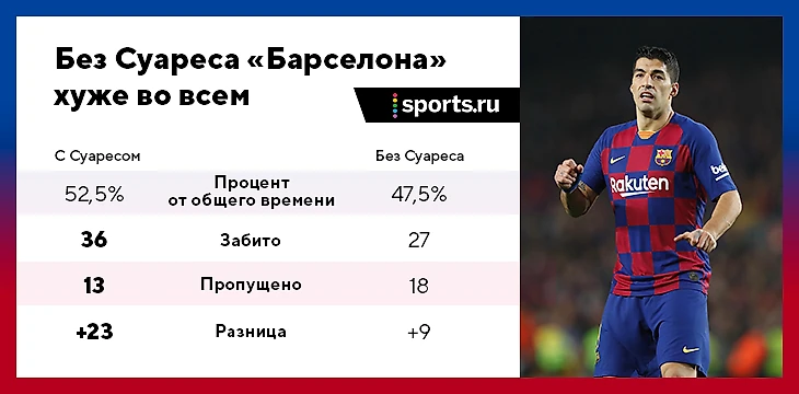 Влияние уругвайца на игру команды в целом тоже огромное. Он сыграл и пропустил примерно одинаковое количество минут, поэтому общие выводы можно сделать из простого сопоставления – с ним и без него. Для совсем полной картины нужно учитывать еще трудность матчей и другие детали, но тут ситуация пугающе очевидна: