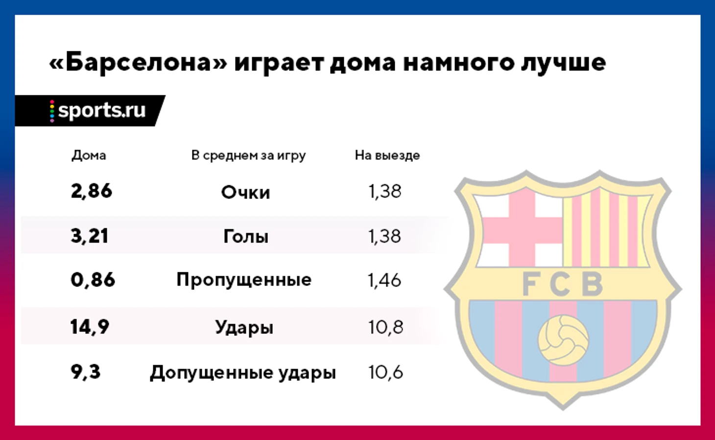 На выходе получаем картину, где у «Барсы» слегка ухудшается игра в домашних играх (но там все равно большой задел, так что не очень страшно), зато гостевые матчи становятся заметно проще.