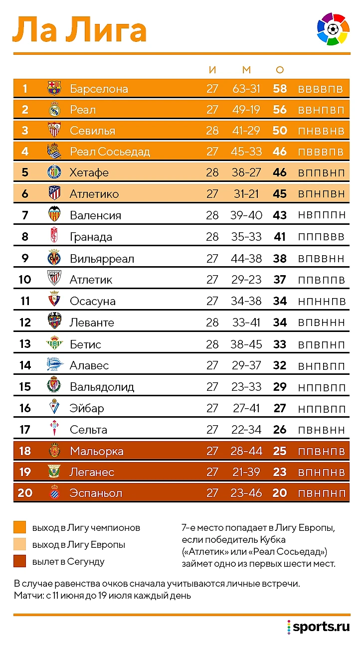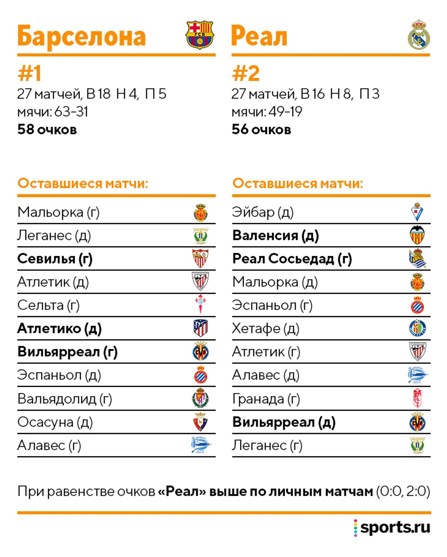На дистанции 27 туров эти сильные и слабые стороны привели к примерно равному положению команд. До паузы выбор фаворита сводился к ответу на вопрос «Что важнее – гений Месси при неровной игре или прессинг/командная игра, но с плохой реализацией?» (плюс нужно было учесть пару дополнительный детелей: 2 очка преимущества у «Барсы», но более простой календарь у «Мадрида»).