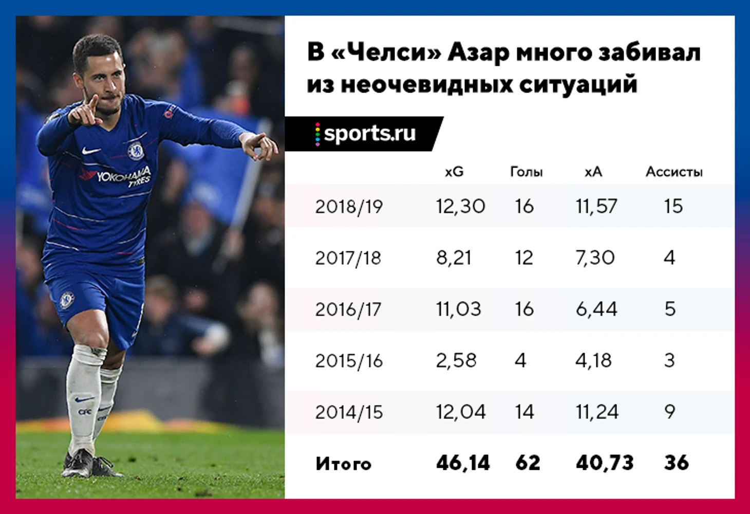 В лучшей форме Азар – футболист, вокруг которого нужно строить команду. Ценное оружие в позиционных атаках (стягивает соперников и освобождает партнеров) и мастер голов из неочевидных ситуаций. Последнее особенно важно для команды, которая страдает от плохой реализации: