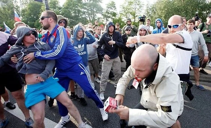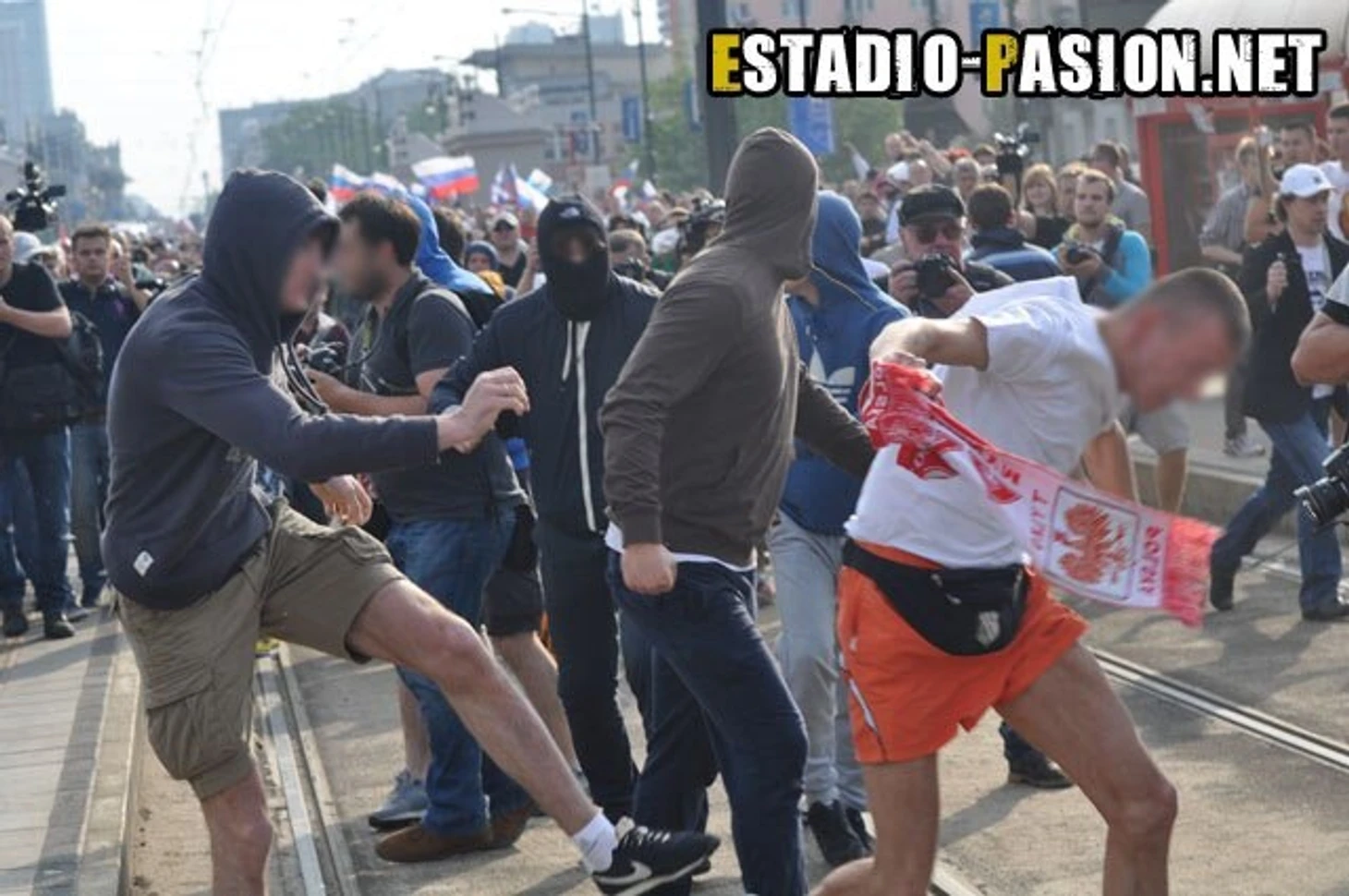 "Поглазеть" на Русский марш пришла огромная толпа местных "акционеров", периодически провоцирующих и выкрикивающих оскорбления в адрес наших соотечественников. Одними криками дело, естественно, не ограничилось: молодые поляки стали нападать на хвост российской колонны, выдергивать из него отдельных болельщиков и избивать. Однако по периметру российскую колонну «вели» не только полицейские, но и представители российских фирм — именно эти безмолвные парни в капюшонах встали на защиту «кузьмы» от местного хардкора, и даже пару раз погнали наглых поляков в противоположную сторону от русского марша с криками "Давай говно".