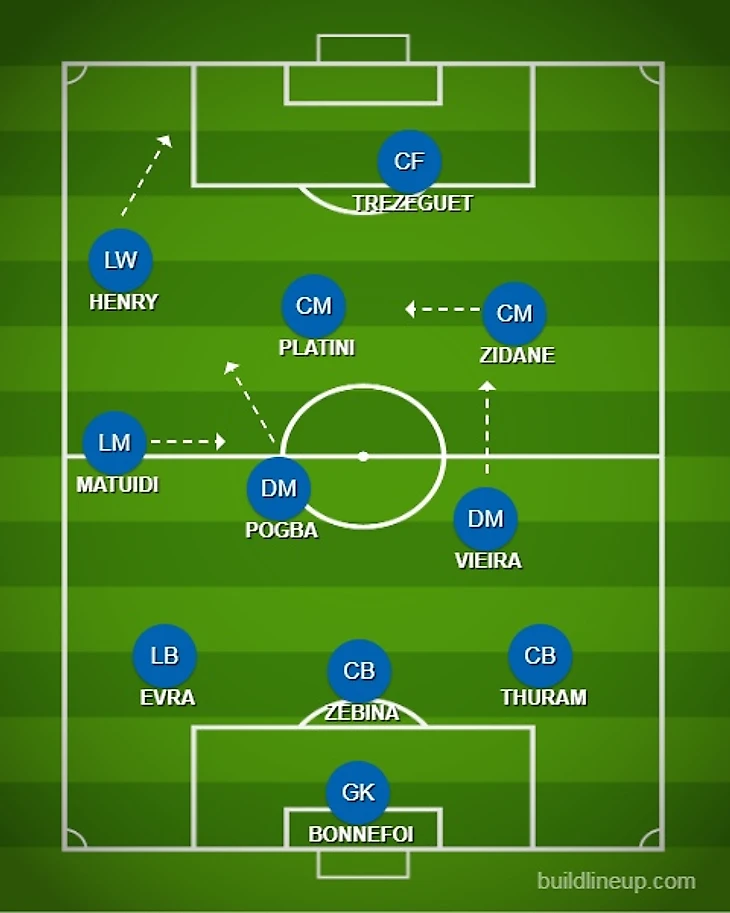 В опорной зоне Франция представлена суперзвездами, Патриком Виейра, Дидье Дешамом, очень полезным Блезом Матюиди, старательным Жосленом Бланшаром и бесполезным Адриэном Рабьо.