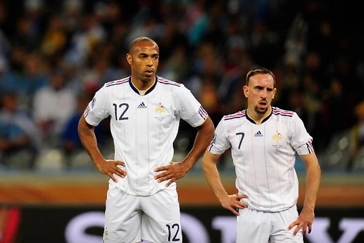 Нападающие: центральный Давид Трезеге, Тьерри Анри с акцентом налево.