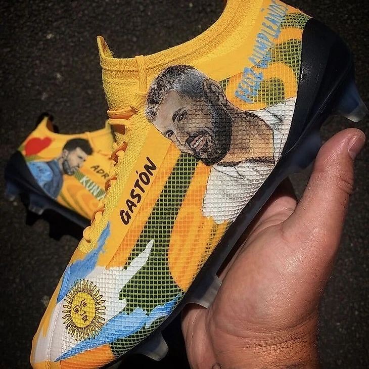 На бутсах – сам Агуэро: в футболке «Сити» и домашней рубашке.