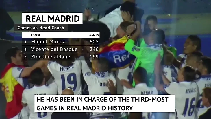 По общему количеству матчей Зидан все еще далек от Мигеля Муньоса (605), и у него еще есть один сезон, чтобы побить достижение Висенте дель Боске — 246 игр.