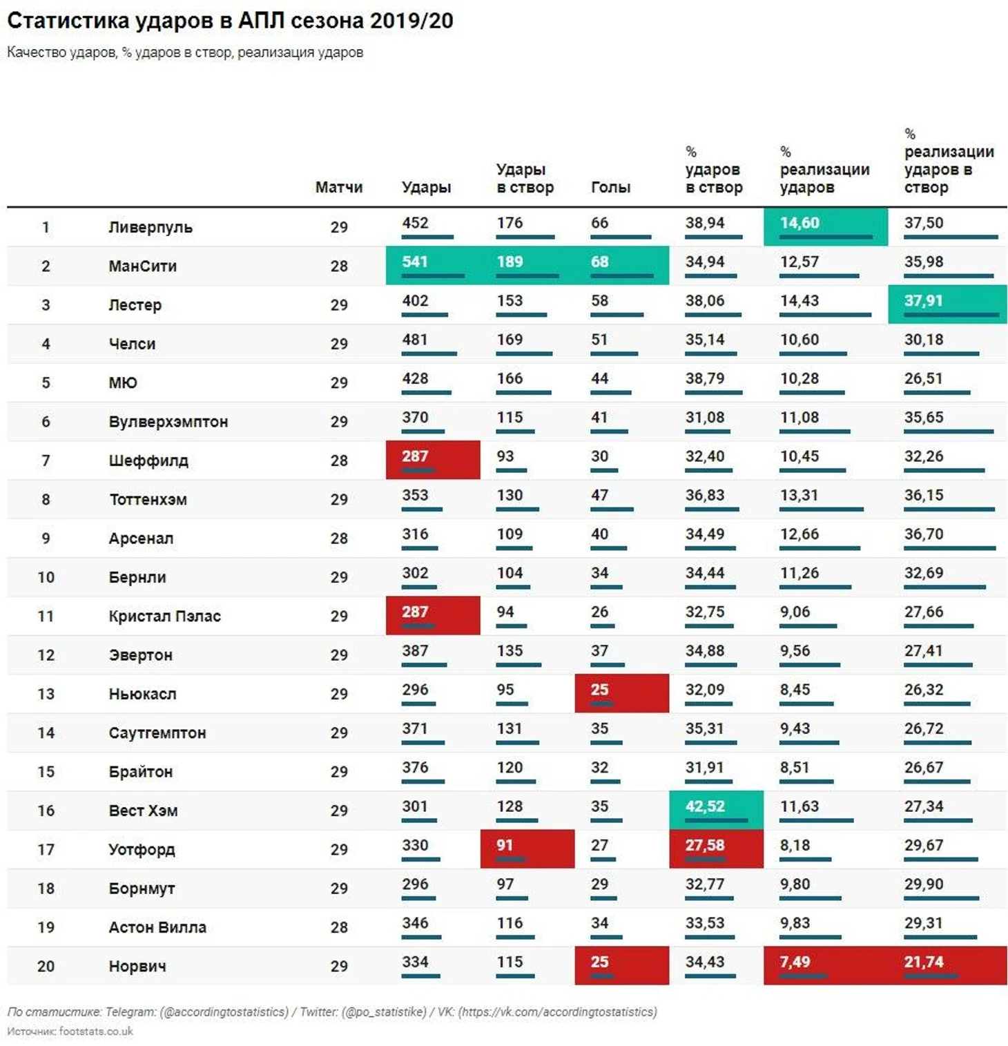 По реализации всех ударов лучшим стал «Ливерпуль» (14,6% ударов заканчиваются взятием ворот).