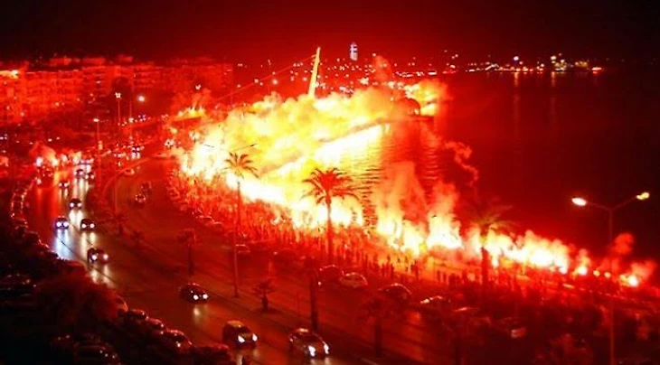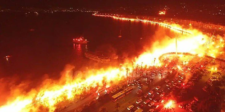Сотни (а то и тысячи) болельщиков Гёзтепе собрались в ночь с субботы на воскресенье на набережной Измира (третий по численности населения город Турции) для того, чтобы отпраздновать 95-летний юбилей родного клуба. Получилось ярко, можно даже сказать, что огненно!