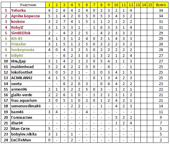 Коллямба (диск.) – joigfyu (нет прогноза) обоюдное поражение (Это же надо забыть прислать прогноз на игру с дисквалифицированым игроком :-) )