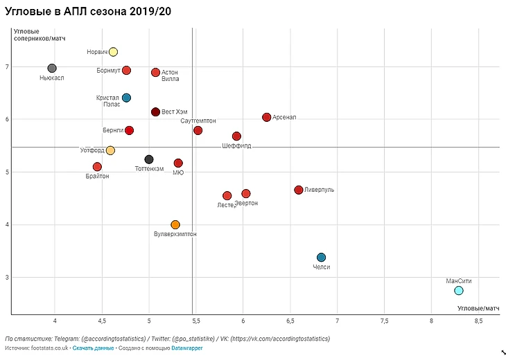 «Ньюкасл» в среднем подаёт меньше всех угловых в лиге (3,97), а «Норвич» чаще остальных получает угловые у своих ворот (7,28).