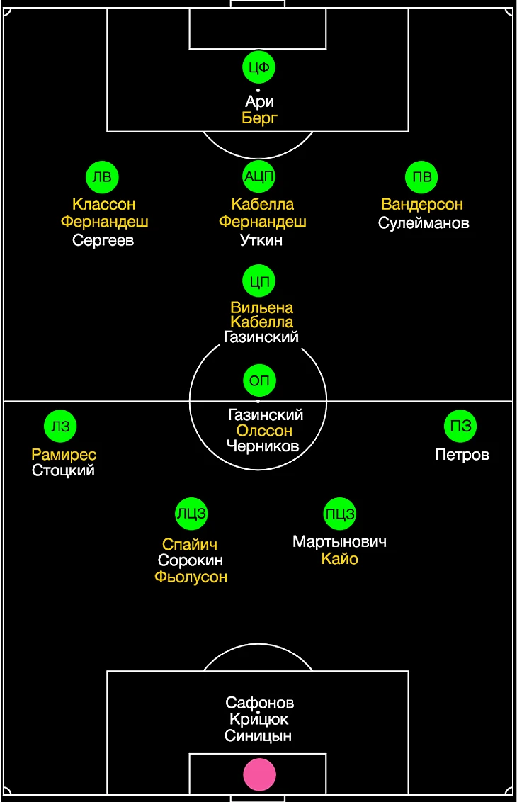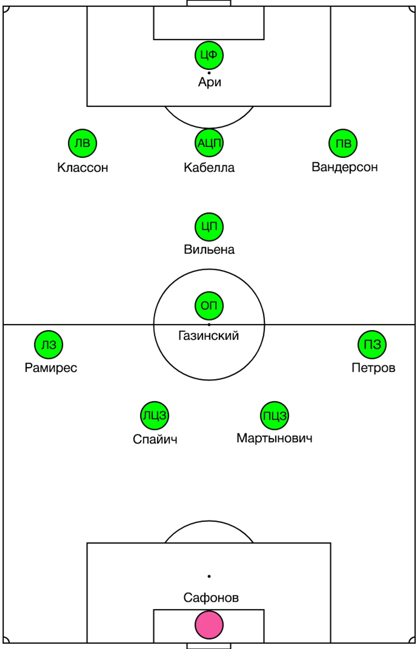 Сафонов – Петров, Мартынович, Кайо, Рамирес – Черников, Газинский, Оллсон, Вильена – Вандерсон, Берг.