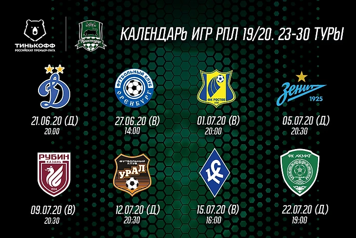 Оставшиеся игры легко можно разделить на два неравнозначных отрезка – до игры с «Зенитом» включительно и после. Старт у «Краснодара» крайне тяжелый – до «Ростова» и «Зенита» придётся сыграть с набравших 7 очков в трёх весенних играх и идущим на шестом месте «Динамо» и очень неудобным по последним личным встречам «Оренбургом». «Газовики», впрочем, зимой потеряли своего главного тренера Владимира Федотова и проиграли последние две игры весны с общим счётом 2:8.