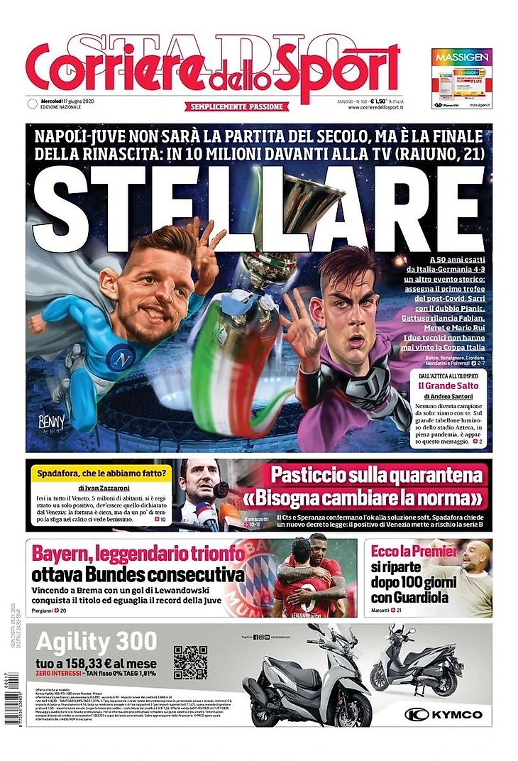 21:00 (CET), в прямом эфире на Rai 1: «Наполи»-«Юве» на «Олимпико» разыграют Кубок Италии. Гаттузо и Сарри в поисках первого итальянского трофея. Рино: «Хотим выиграть для неаполитанцев». Бьянконеро: «Прошлое? Имеет значение только моя команда».